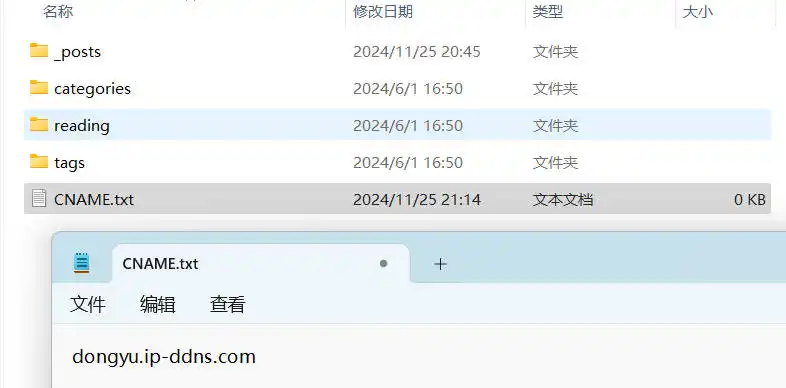 效,所以要在souce目录下添加上CNAME文件,里面填上自己的域名。