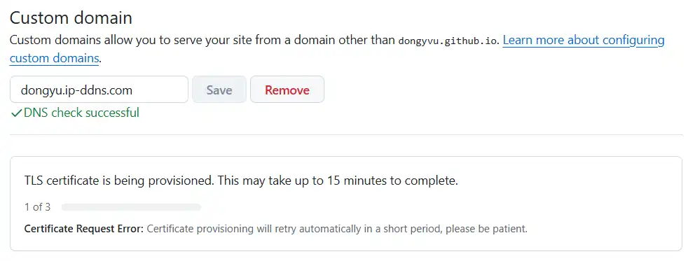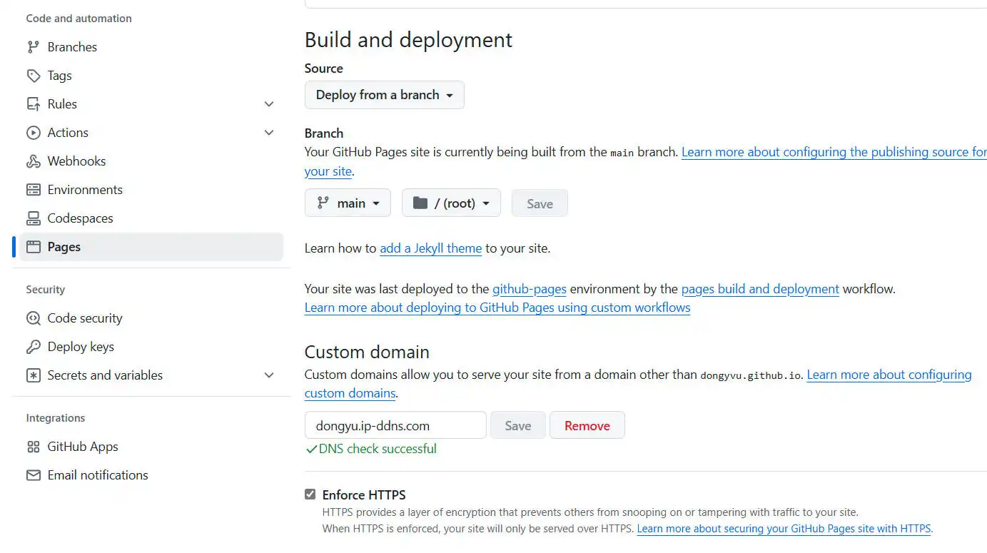 然后去GitHub如下设置自定义域名,成功了会显示DNS check successful,然后再等十几分钟,因为证书要刷新。最后记得清除浏览器缓存再看效果!!!