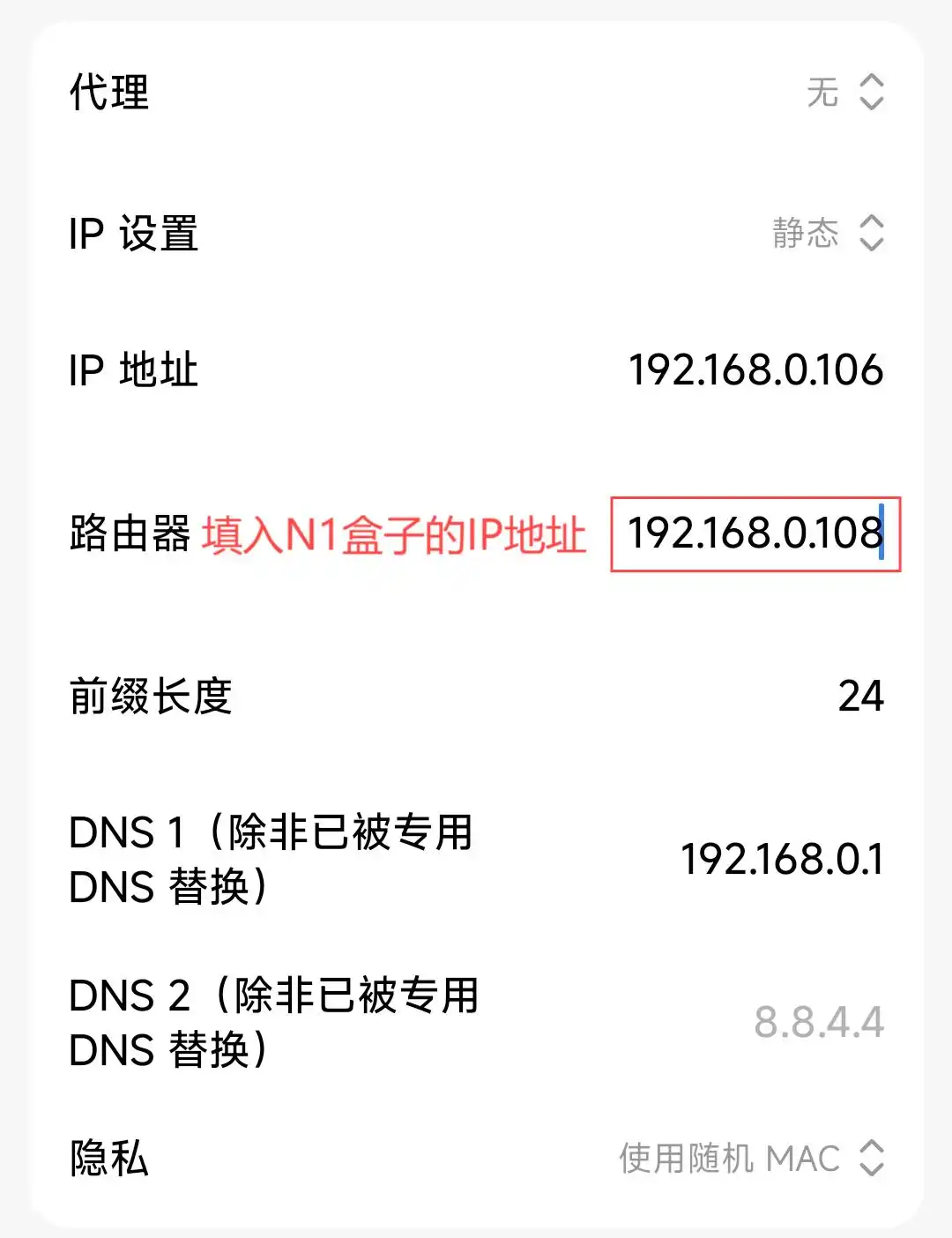 连接上N1盒子或光猫的WiFi,设备手动指定路由器(有些设备称为“网关”),如下图配置。