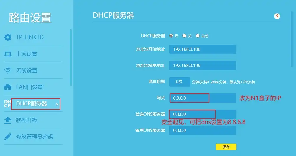 进入路由器管理面板,配置DHCP选项,把“网关”这一项设为N1盒子的IP,并且把N1盒子获取IP的方式设置为静态(下文讲解)。