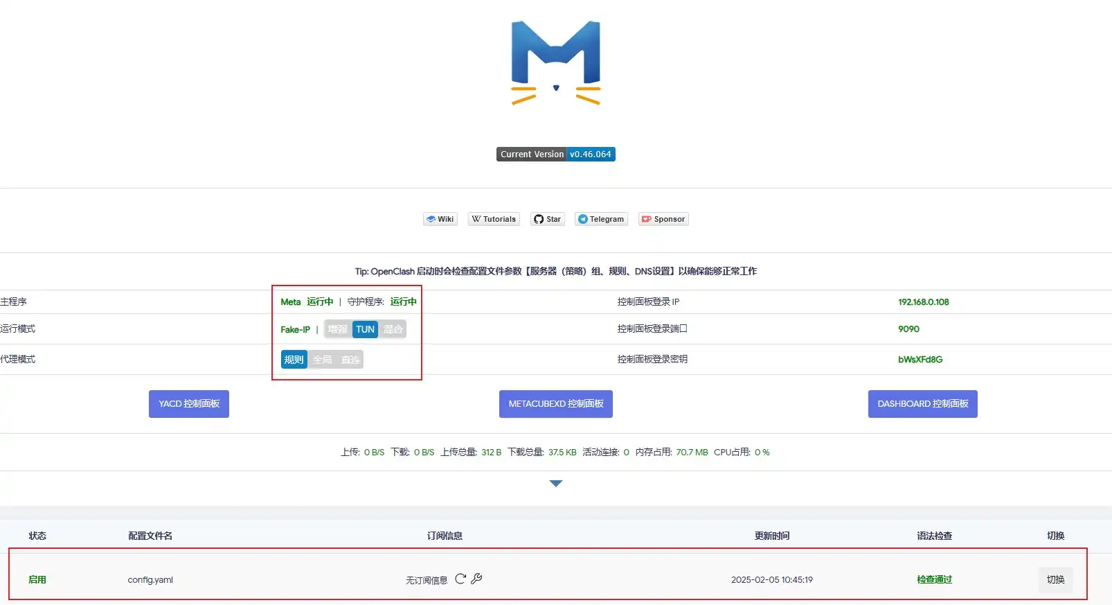 返回主页,会看到配置已经导入。经过我的测试,我的N1盒子仅在TUN模式时本机可用(终端ping google不会超时)。